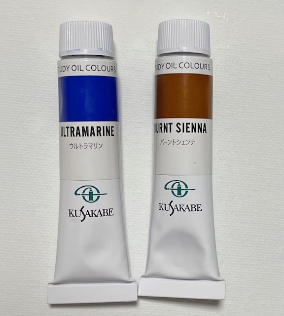 今回使用するのは、ウルトラマリン(青)とバーントシェンナ(こげ茶)です。
